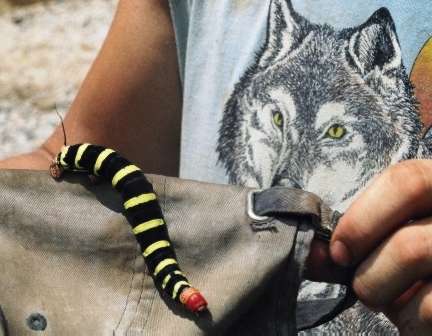 Austin finds the biggest caterpillar around. (pseudosphinx tetrio) |