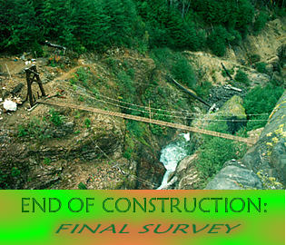 The photos on this page show two views of the bridge nearing completion in 1993. In 1999, Sahale was retained by the U.S. Forest Service to provide an inspection, adjustment, and maintenance services for the Lava Canyon Bridge, and to develop and implement engineering upgrades to the railing and fence system.