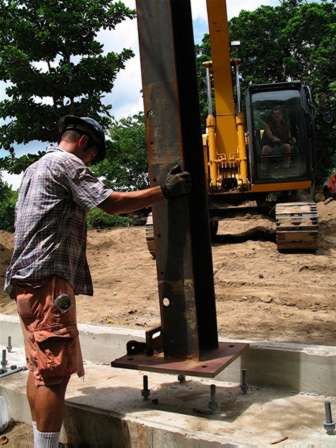 Brandon sets the first tower leg.